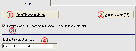 | 1. | CRYPTZIP aktivieren / deaktivieren | Aktiviert oder deaktiviert abylon CRYPTZIP. |