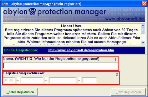 Wenn Sie schließlich den Registrierungsschlüssel erhalten haben, so rufen Sie diesen Registrierungsdialog auf und tragen exakt Ihren Namen in Feld 1 und den Registrierungsschlüssel in Feld 2 ein. Jetzt müssen Sie nur noch das Button 'Jetzt Registrieren' klicken und der Eintrag 'nicht registriert' verschwindet aus den Kopfzeilen und alle Beschränkungen werden aufgehoben.